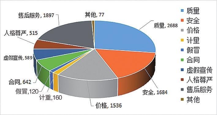 质量问题2688件,占投诉总量的27.13%;售后服务问题1897件,占投诉总量的19.15%;安全问题1684件,占投诉总量的17.00%;价格问题1536件,占投诉总量的15.50%。质量问题、售后服务问题、安全问题占据了消费者投诉的前三名。