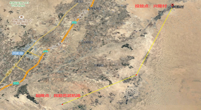 此次测试以民勤苏武通用机场为起降点,民勤县收成镇兴隆村“请到民勤种棵树”生态治理活动现场为物资投放点,使用HY-600大型无人直升机执飞作业,航线单程规划39.8公里,飞行真高200米,挂载医疗、饮用水、通讯设备等80公斤应急物资。无人机通过超视距飞行到达目标区域后悬停,使用电控装置进行物资精准投放,完成投送后安全返航。飞行全程通过微波链路与卫星通信双链路实时监控,指挥中心大屏上清晰显示飞行轨迹、风速数据及载荷状态。