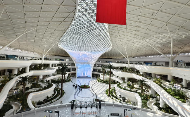 作为国家“十四五”重点交通工程,T3航站楼创新采用“主楼+三指廊”设计,面积达40万平方米,超过了T1和T2航站楼总和的4倍,配备超70个登机桥位,可满足年旅客吞吐量3800万人次、货邮吞吐量30万吨、飞机起降30万架次的规划设计目标。