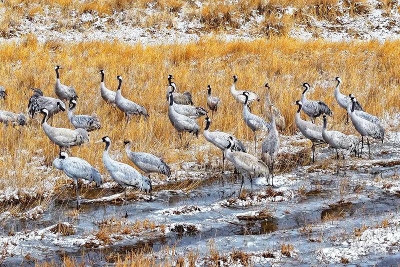 在嘉峪关草湖国家湿地公园休整的灰鹤(央广网发 嘉峪关市融媒体中心供图)