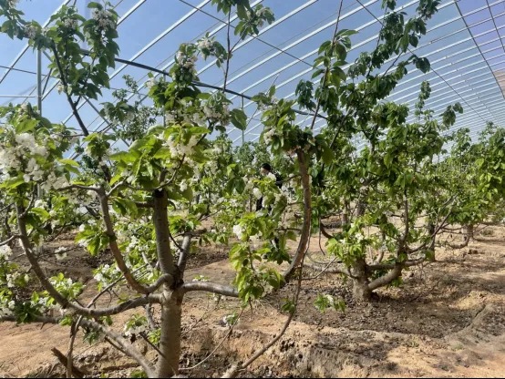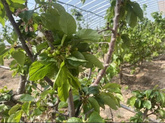 走进占地2.5亩的温室大棚,温暖湿润的空气裹挟着淡淡花香扑面而来。棚内80株改良樱桃树正舒展枝条,低矮横向生长的树冠上,白花簇簇掩映着青豆大小的幼果。大棚管理人员穿梭其间进行人工授粉,为即将到来的丰收精心护航。“这些从红古区引进的优质种苗,经过两年本土化培育,去年已初现成果。”基地负责人孙天渊轻抚枝头青涩果实,眼中满是对“科技兴农”的自信。