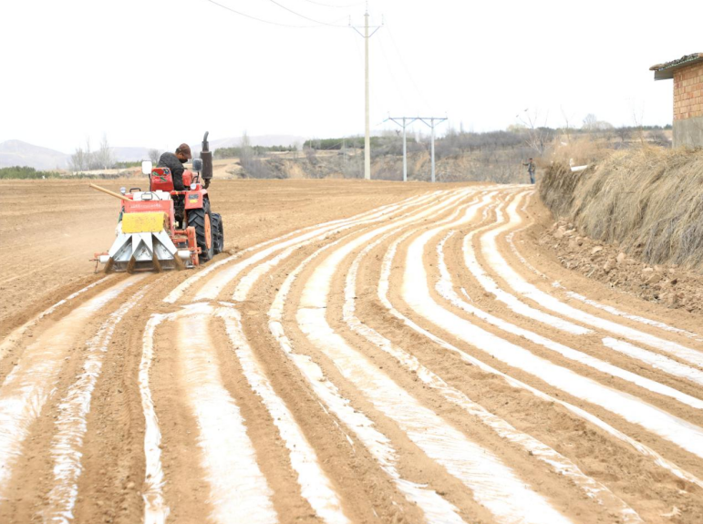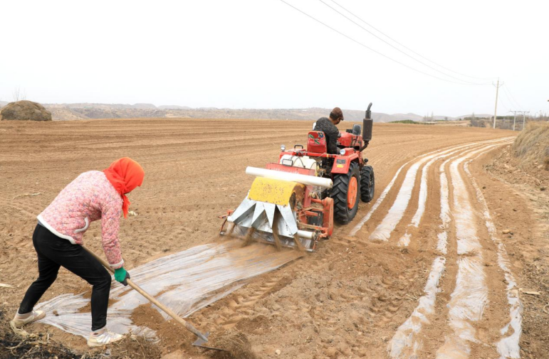 覆膜后,土地保墒增温效果明显,玉米等作物出苗更快、更齐,为作物早播、早熟创造条件。“如今我们铺地膜,都使用的是覆膜机,省时省心又省力,我今年打算多种些玉米,保证自己养羊的草料。”八珠塬村东庄组村民杜林平一边熟练地覆膜一边用劲挥锹培土。