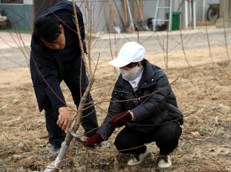 每一剪都藏着增收的学问,手起剪落间,一根根病弱枝应声而断。环县腾汛农业发展有限责任公司负责人李春富,如今也是专业的技术员,“剪枝不是砍树,是给果树做减法,有的长枝看着粗壮,其实只长叶不结果,留着它抢养分,要适时减掉它。”李春富和工友们穿梭在桃林间,目光扫过桃树枝干,迅速判断出哪些是“残枝”,修剪一新的桃树行列齐整,枝头嫩芽蓄势待发。