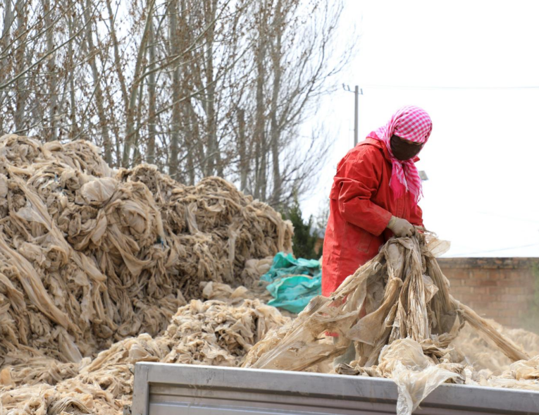 “这些废旧地膜没人要,扔在地里随风刮,村前屋后、地头树梢到处都是,污染十分严重。这几天我们组织群众在曹塬村集中回收废旧地膜。一方面可以减少白色污染,另一方面实现旧地膜资源化回收利用。”八珠乡曹塬村党支部书记邓锋说道,“农户这几天把废旧地膜拉来,交到村上回收点,我们随时登记,登记完以后根据废旧地膜方数到村部换取新膜,大家的积极性都很高。”