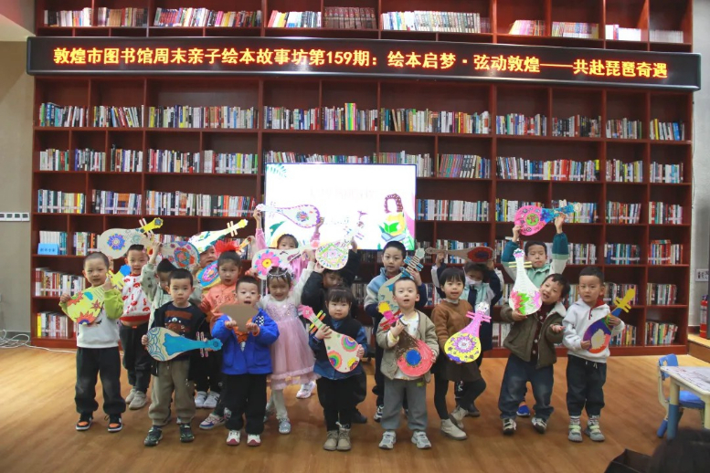 当日下午,“绘本启梦·弦动敦煌——共赴琵琶奇遇”少儿故事坊活动率先开启,吸引了30余名小朋友在家长的陪同下积极参与。来自白马塔幼儿园的权卉老师以绘本《了不起的丝绸之路》为切入点,借助生动的语言和轻快的音乐,引领孩子们“穿越”千年丝路,开启一场奇妙的文化之旅。故事主人公“敦敦”的冒险历程中,巧妙融入敦煌壁画、西域美食以及乐器等知识。在互动问答环节,孩子们踊跃发言,分享自己对敦煌的认知与理解。
