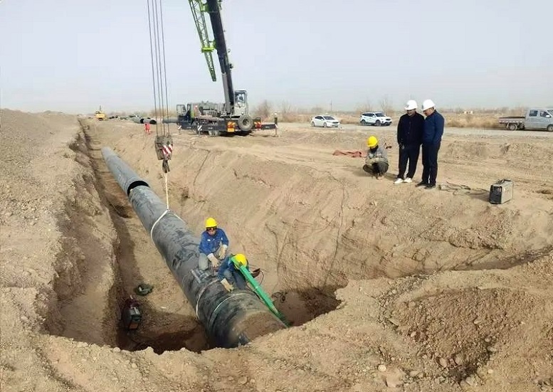 大型挖掘机挥动着巨臂,运输车辆往来穿梭,挖掘机正进行管沟土方开挖,伴随着机械的阵阵轰鸣,焊花飞溅,工人们头戴安全帽,手持工具正在紧锣密鼓地进行管道安装……尽管近期气温偏低,但施工现场的火热氛围让人感受到了春天的气息和建设的热情。