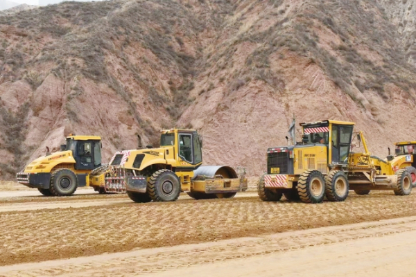 近日,记者来到该项目位于达板镇的路基填充施工现场,连绵的黄土山峦间大型机械的轰鸣声此起彼伏。站在山梁上向下看,平地机、压路机等轮番上阵,进行路基填方施工。随着一车车土方倾倒,一条沟壑逐渐被填平。