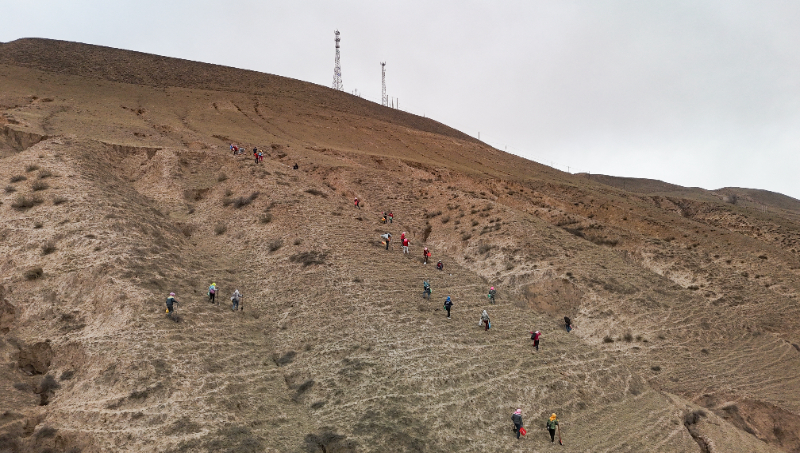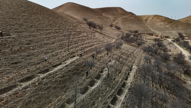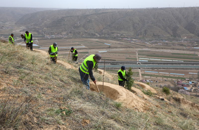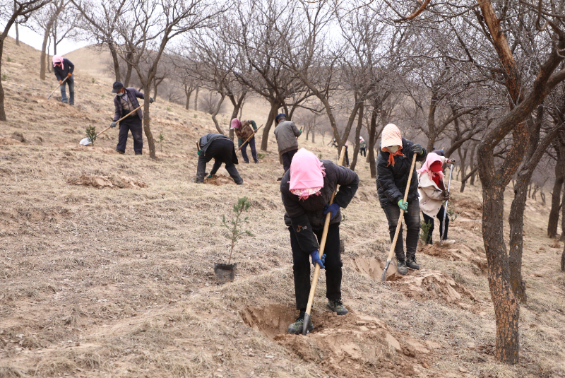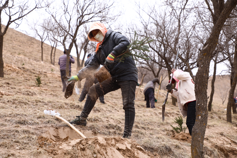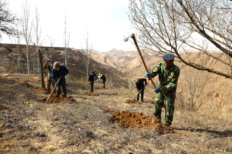 在环城镇漫塬村委会附近原本荒凉的大山上,工人们三两成组,手持撅头、铁锹等工具,在开花的老杏树下掘土栽苗,干劲十足。“栽植苗木时要深挖浅栽,埋土深度一定要达标。”项目负责人苟乐在植树现场一边示范,一边向工人们讲解植树流程与注意事项。经过一下午的紧张劳作,原本荒芜的土地上,新栽的树苗已然挺拔而立,在微风中展现出勃勃生机。
