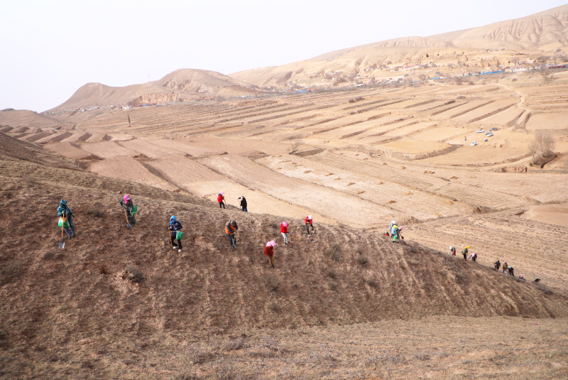 四月春日午后,记者驱车来到甜水镇大良洼村时,近50名工人正一行行整齐地排列在靠近国道的一面阳山坡上,他们迎着风沙,采用鱼鳞坑整地、人工点播的方式将稚嫩的柠条苗一一种下。