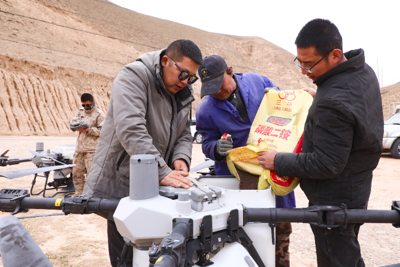 鲁掌村位于甜水镇西部,与何塬村接壤于宁夏,属毛乌素沙漠南缘,是“三北”工程实施地之一。经环县自然资源局测定,该村荒山土质缺乏氮磷钾等微量元素,导致土壤贫瘠,植被稀疏,沙化地带盛期植被盖度仅20%。为此,环县在此处实施“三北”工程林草湿荒一体化保护修复项目草原改良项目,用无人机撒播化肥磷酸二铵,进行土壤改良。“通过土壤改良,提高土壤的肥力和生产力,促进植被恢复,有助于恢复草原生态系统的结构和功能,增加植被覆盖度和生物多样性,从而提高草原的生态服务价值,环县自然资源局干部韩龙介绍说,“截至目前,全县已完成退化草原改良修复35万亩,占总任务的58%。”