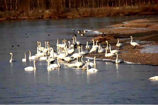 随着气温持续上升,在黑河板桥段,大天鹅、灰雁、赤麻鸭等大批越冬候鸟在河面翩翩起舞,与湛蓝的天空、岸边茂密的红柳、蜿蜒纵横的沙枣树和干净的河床、澄澈的河水共同编织出一幅优美灵动的生态画卷。
