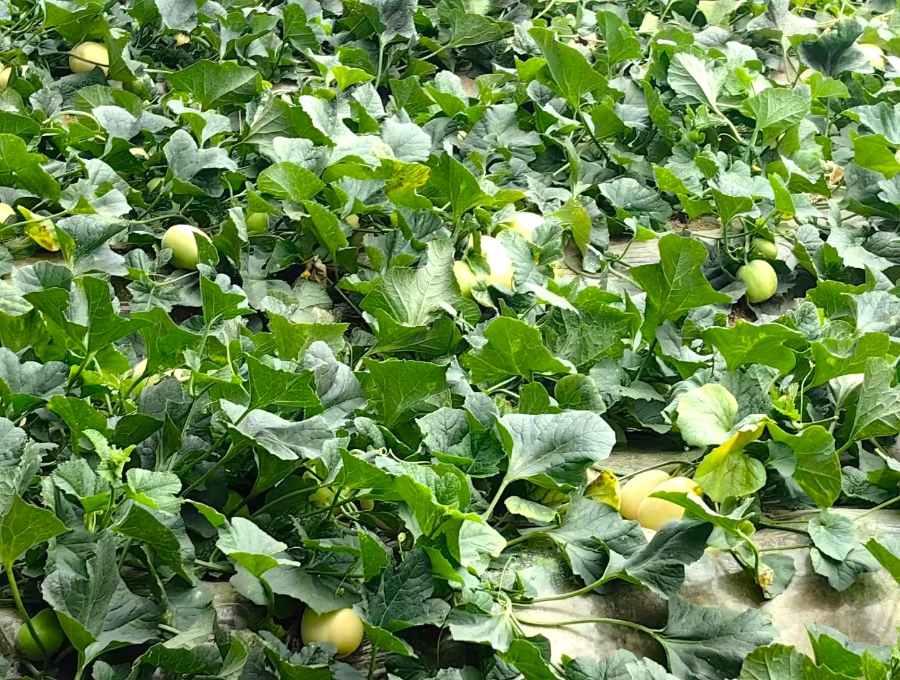 循着清甜的气息,记者走进了香瓜大棚。只见一个个圆润的香瓜安静地躺在藤蔓上,惬意地享受着春日暖阳。它们表皮泛着淡淡的光泽,纹路清晰自然,凑近一闻,一股浓郁的甜香味直扑鼻息,令人垂涎欲滴。李世鑫说道:“我们这儿的香瓜品种多样,星甜20、24号和博洋9号在市场上都是‘抢手货’。今年大棚香瓜提前一个月开园上市,种植过程中采用了多项新技术,通过智能温控系统精准调节棚内温度、湿度和光照,模拟最适宜香瓜生长的气候条件,香瓜生长周期更稳定,甜度和口感都大幅提升。”