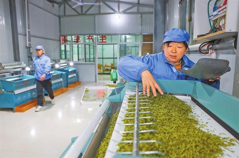 在文县范坝镇关子村关山翠茗农民种植专业合作社茶叶加工车间,新鲜采摘的茶叶经过摊青、杀青、揉捻、干燥等工序,最终蜕变为成品茶。新甘肃·甘肃日报记者 冯乐凯
