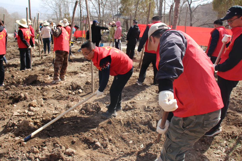广大党员干部热情高涨、干劲十足,挥锹铲土、培土围堰、提水浇灌……大家分工合作、齐心协力、默契配合。此次植树活动共种植树苗500余株,经过辛勤劳动,一株株树苗扎根在土里,在春风中昂然挺立、生机勃勃。