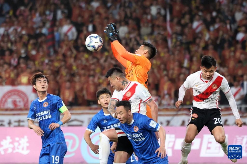 4月18日,兰州陇原竞技队球员吾麦尔·阿布都克力木(左)在比赛中拼抢。新华社记者 陈斌 摄