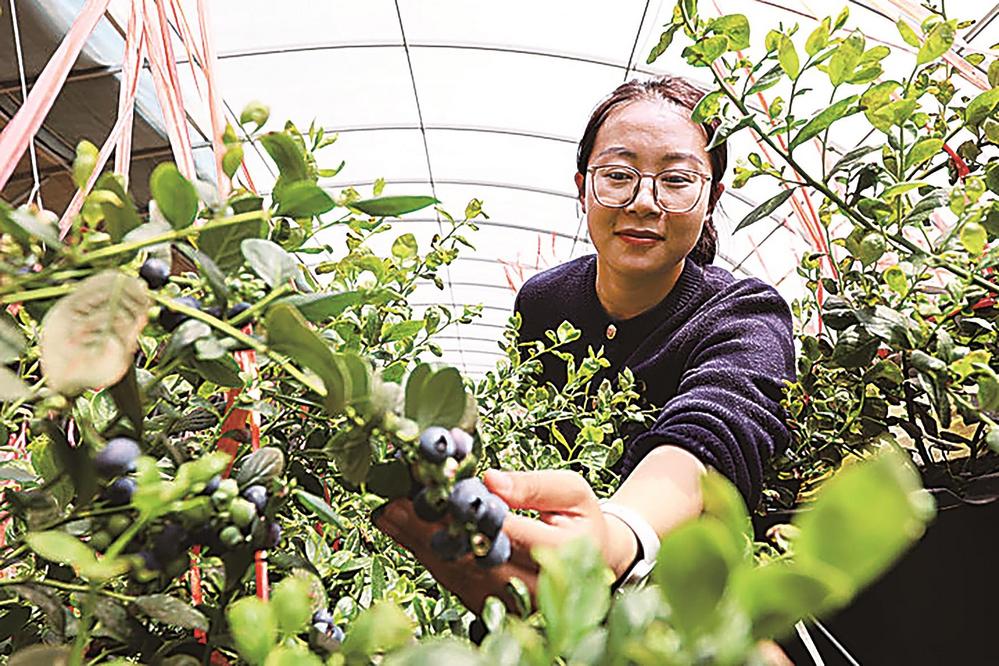 今年,临泽县通过龙头企业、产业大户及家庭农场等新型农业经营主体示范引领,大力发展现代设施农业,持续延伸拓展产业链,经济效益稳步提升。图为游客在沙河镇新合作百惠蓝莓种植基地采摘蓝莓。 (记者 张 渊 摄)