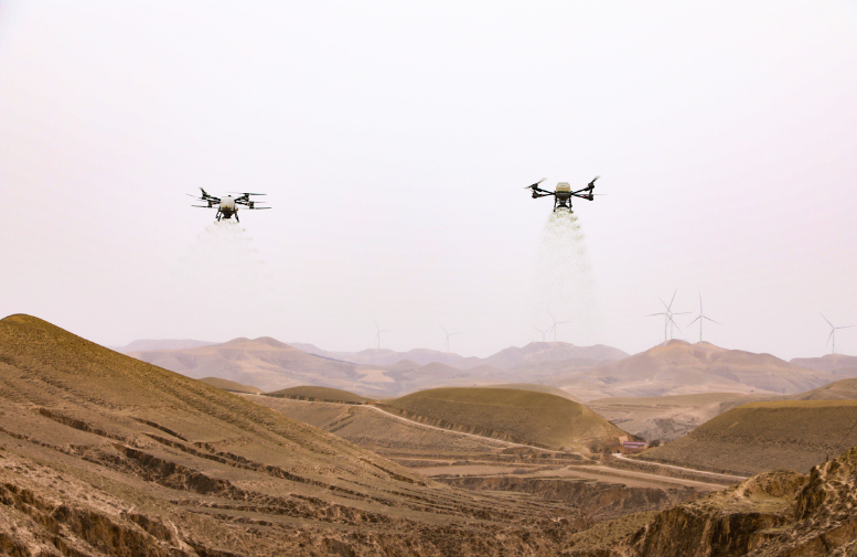 在环县甜水镇鲁掌村,两名无人机机手分别操控着栽种100公斤和60公斤重的植保无人机,以每秒10米速度掠过山梁上的沟沟坎坎,将磷酸二铵化肥播撒在贫瘠的草原上。