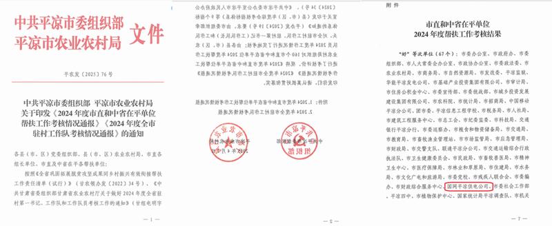 近日,平凉市委组织部、平凉市农业农村局联合发文公布2024年度市直和中省在平单位帮扶工作考核情况,公司驻村帮扶工作连续第三年获平凉市政府年度考评“好”等次。