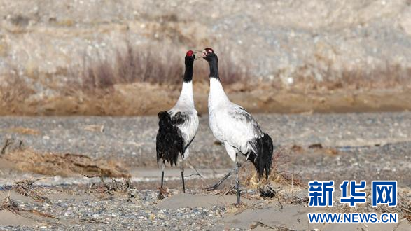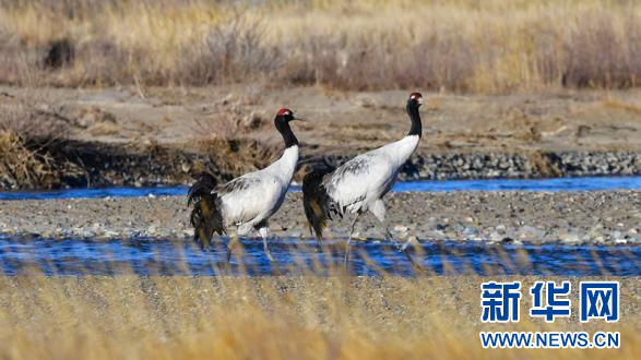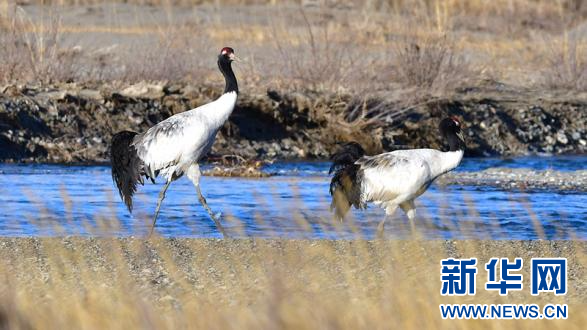 近日,在甘肃祁连山保护区祁丰自然保护站,工作人员惊喜地拍摄到两只黑颈鹤,并发现巢穴。画面中两只黑颈鹤宛如一对优雅的舞者,或并肩踱步,或交颈亲昵。这是保护区首次迎来黑颈鹤定居的珍贵记录。