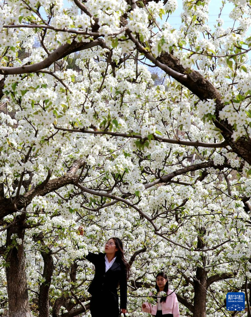 4月25日,在位于黄土高原的甘肃省平凉市静宁县界石铺镇李堡村,游客在梨园里赏花。新华社发(王毅摄)