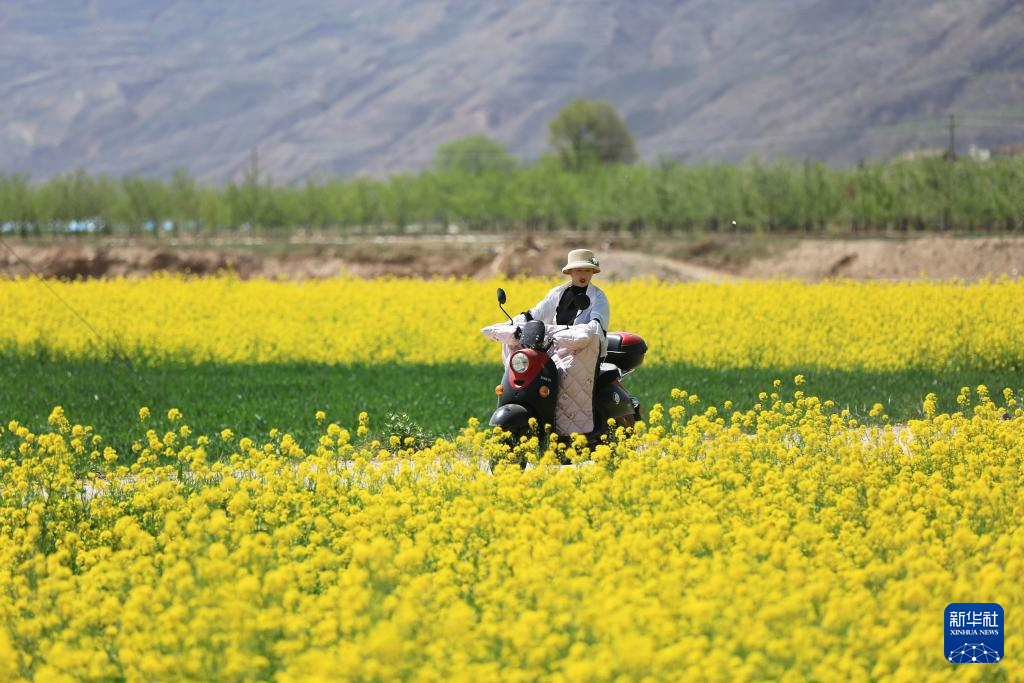 4月25日,在位于黄土高原的甘肃省天水市武山县,当地村民骑行经过油菜花田。新华社发(王克贤摄)