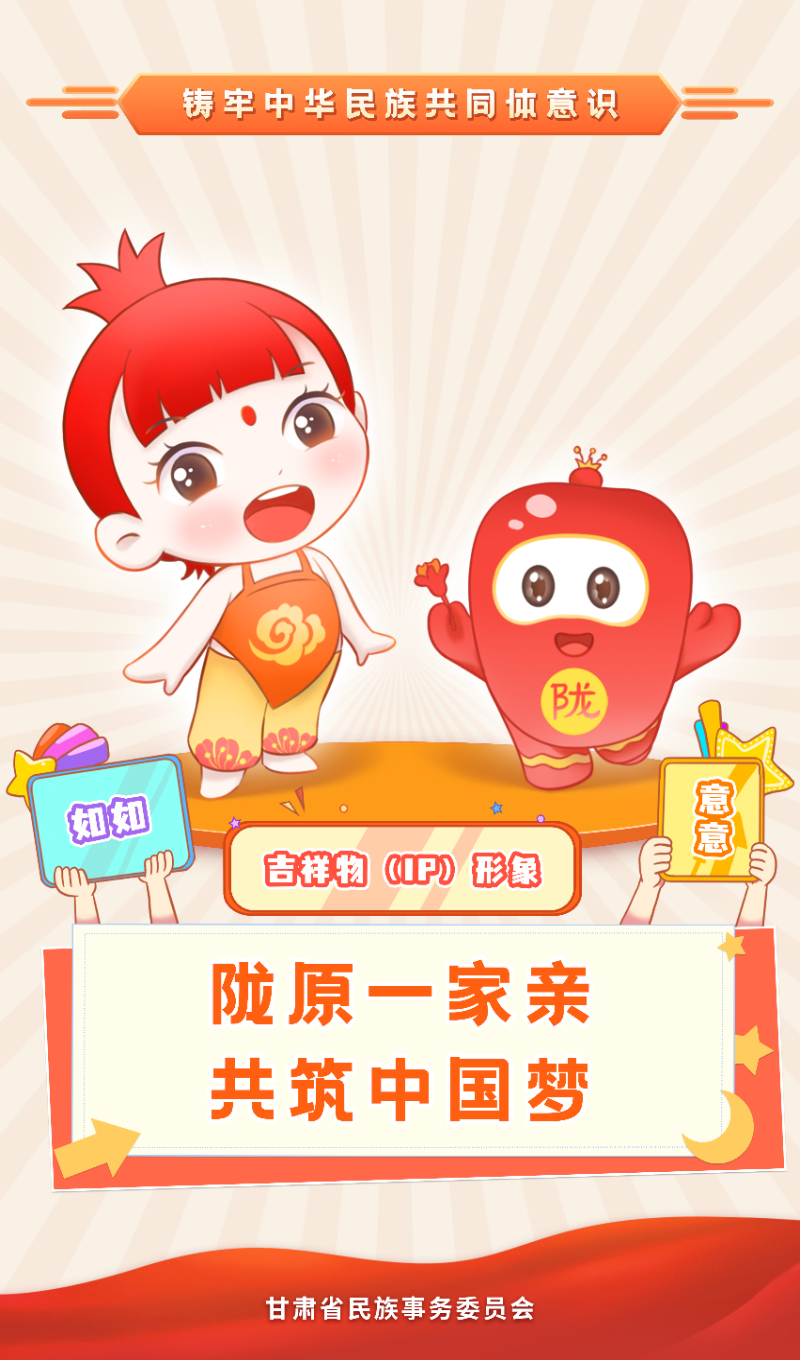 甘肃省铸牢中华民族共同体意识宣传教育吉祥物形象为“如如”和“意意”,寓意“如如意意,同心筑梦”。“如如”的整体设计以传统艺术形式年画和石榴形象为灵感,整体形象活泼可爱;“意意”的整体设计以“石榴籽”形象为基础,象征着各民族像石榴籽一样紧紧抱在一起。