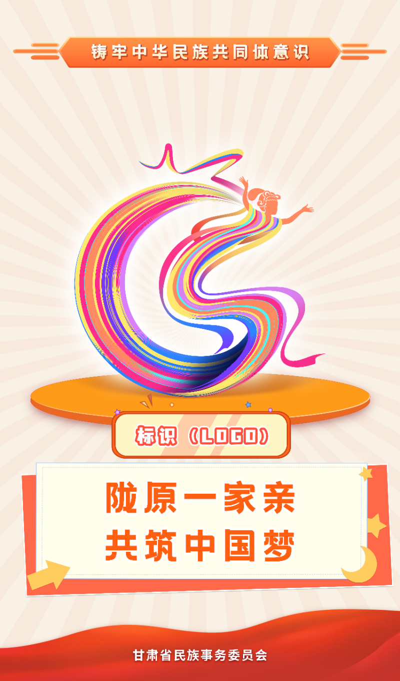甘肃省铸牢中华民族共同体意识宣传教育标识以“甘肃”拼音首字母“G”“S”以及敦煌飞天和石榴形象为设计主体,各色线条交融汇聚,体现了陇原各族人民守望相助、手足情深,共同团结奋斗、共同繁荣发展的时代主题,以及各族儿女团结一致、同心同向,勇于创新、苦干实干,奋力谱写中国式现代化甘肃篇章的精神风貌。