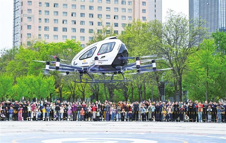 2025数字中国创新大赛·低空经济赛道活动中,亿航智能公司eVTOL在庆阳市区和谐广场起飞。 陈飞