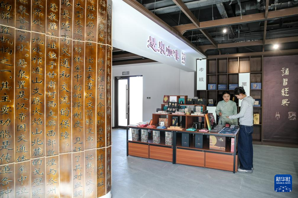 4月29日,游客在悬泉置遗址景区挑选文创产品。新华社记者 郎兵兵 摄