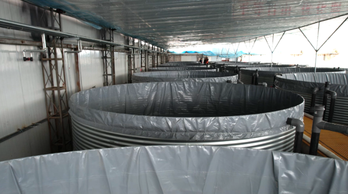 走进其中一座养殖厂房,25个直径6米、深度1.9米的圆形养殖水池次第排开。“每个水池里能盛放30立方米的水,投放大约2.5万尾虾苗,养殖数量是池塘等传统养殖方式的3-5倍。”走到一处水池边,郭子有停下了脚步,他指着水池底部的输氧细管说,“2.5万只虾能惬意生长,全凭我们强大的水循环系统。我们通过物理过滤、生物降解、臭氧杀菌、恒温调节这四级循环水系统,使得水体重复利用率达98%,一年能养殖4-6茬虾。”
