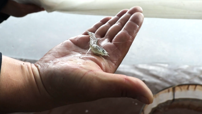 “你看,现在这些虾已经长到差不多8公分了。这是我们在金昌养了1个月的虾,再有2个月的时间,就可以上市销售了。”