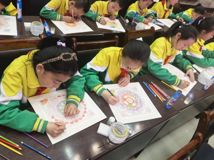 如果说讲座是文化的深度浸润,那么手作体验则让传统文化真正“活”了起来。在藻井画稿创作区,小学的孩子们化身“小小艺术家”,用彩笔精心勾勒敦煌藻井的繁复纹样,调配出层次丰富的渐变色彩,将敦煌美学融入笔尖;初中的学子们则专注于木版拓印体验,执刀雕刻线条、涂抹颜料、按压拓印,在一刀一刻间感受中国传统线条艺术的韵律之美,一幅幅独具个性的拓印作品新鲜出炉,承载着青春创意与文化传承。