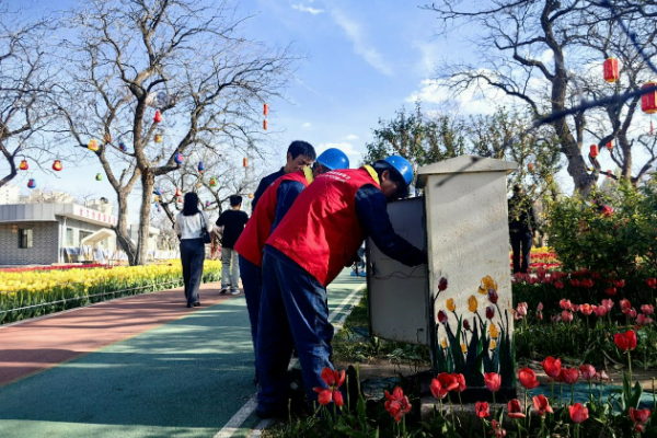 4月29日下午,国网兰州供电公司永靖县供电公司城区供电所党员服务队队员来到郁金香公园,检查前几天查出的隐患处理情况。(朱芳洁摄)