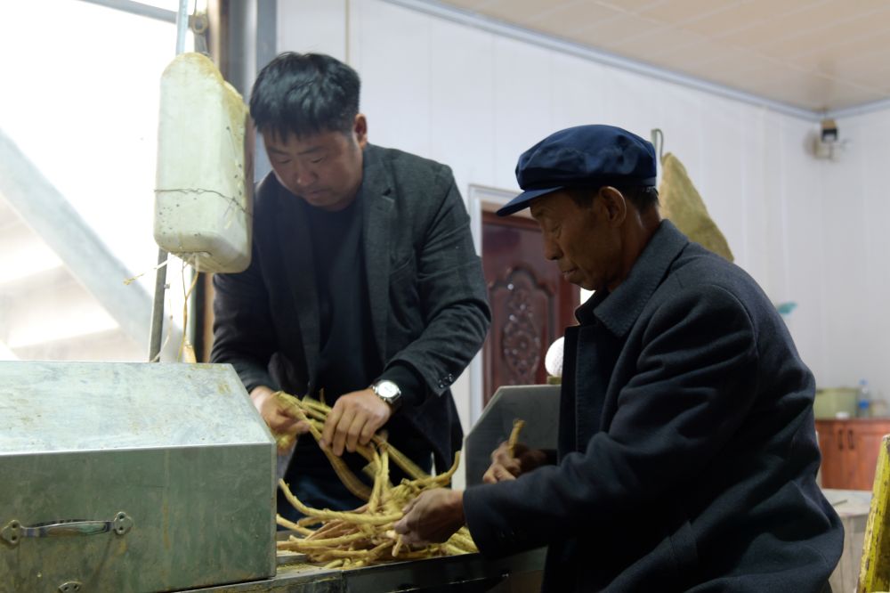 侯虎平(左)在和父亲加工中药材切片。新华社记者 王朋 摄