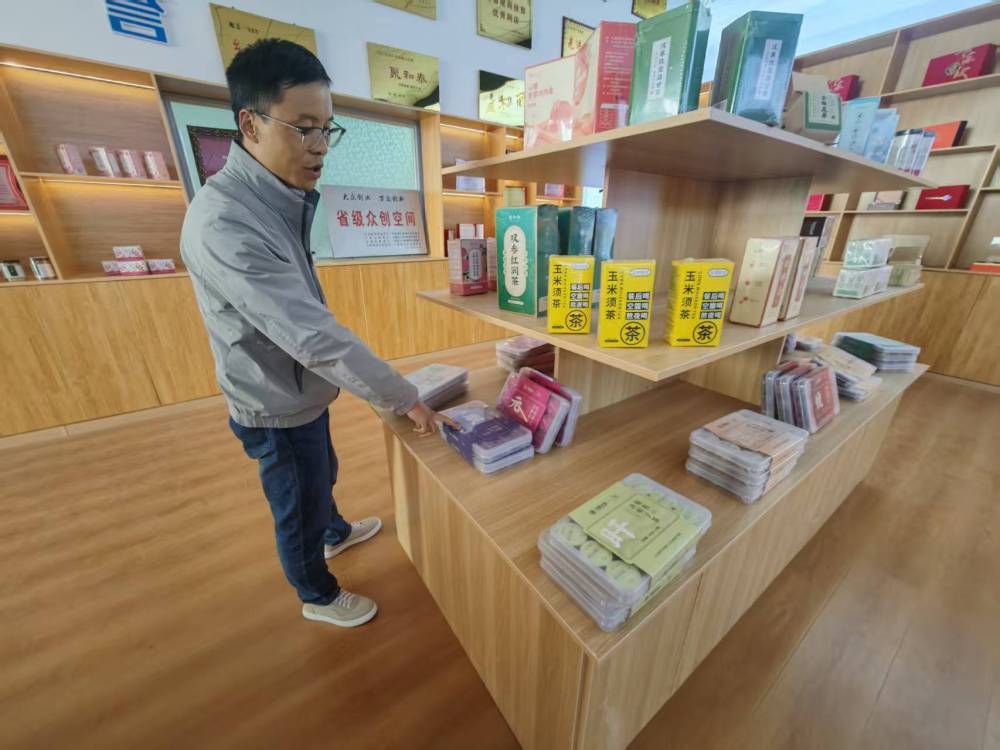 李爱军介绍利用大数据分析创新的中药材茶饮产品。新华社记者 王朋 摄