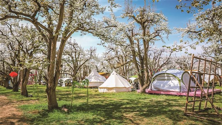 游客在梨园里露营