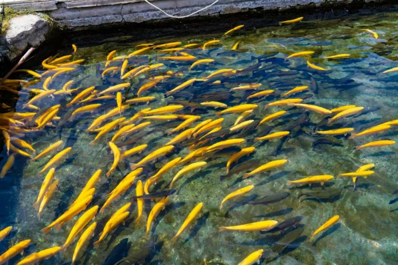 鱼池内,黑色的虹鳟、金色的金鳟以及色彩斑斓的鲑鳟鱼欢快游弋。它们在清澈见底的池水中追逐嬉戏,银鳞闪烁间,为春日的生机增添了一抹别样的景致。孩子们趴在池边,兴奋地指着游动的鱼儿,发出阵阵欢呼;摄影爱好者则架起“长枪短炮”,捕捉鱼儿灵动的瞬间。