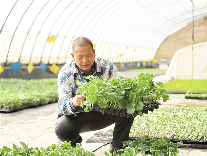 酒泉金涛集约化育苗中心负责人马涛邦在温室内观察种苗长势。吴 歌 摄