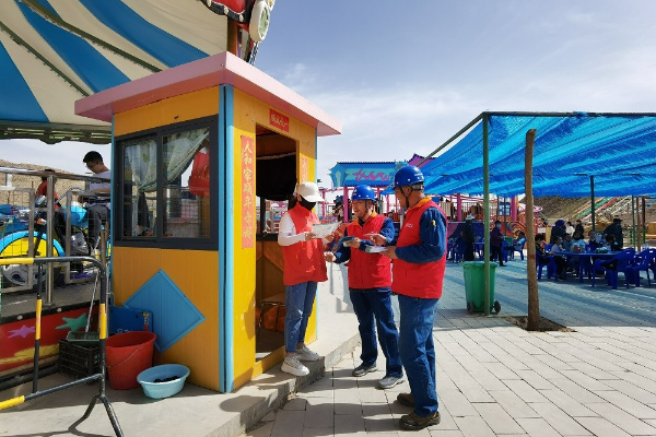 上午9时,在距离凉州城区20公里的古城镇塔尔湾景区入园处,车水马龙、游人如织,“假日经济”的热度与人气可见一斑。作为当地热门旅游景点之一,塔尔湾景区以新颖刺激的游乐设施和丰富的游园体验深受年轻人和小朋友的青睐。在入园游客中,国网武威供电公司设立的“连心桥·光明驿站”格外醒目,遮阳伞、凳子、充电设备等便民设施一应俱全。驿站前,国家电网甘肃电力(八步沙·凉州)连心桥共产党员服务队队员和“黄河之滨”志愿者服务队队员或为游客递上解暑饮品,或向景区商贩讲解安全用电常识。