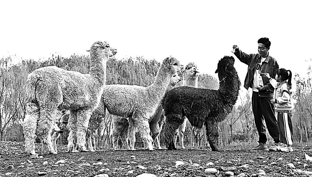 游客同张掖动物园的羊驼互动。本报记者 王 将 摄