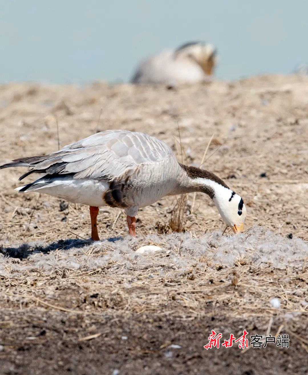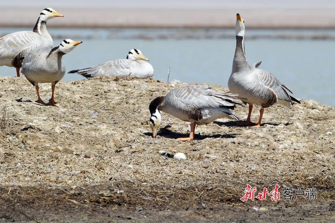 5月4日,阿克塞县阿伊纳乡小苏干湖成群结队的斑头雁在湖泊湿地搭窝育雏,繁育后代。新甘肃·甘肃日报通讯员 高宏善
