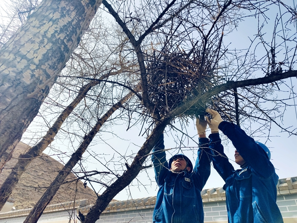 “鸟类筑巢不容易,我们要尽量模拟原来的角度和高度,带好手套,尽量不要留下我们的气味,避免鸟儿弃巢。”李学发边说边向仲滢玲叮嘱。两人带好手套,小心翼翼的固定了鸟巢上松动的树枝,搬来梯子,将鸟巢重新放回到树枝上。