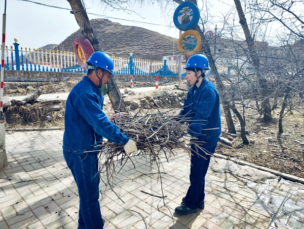 5月9日,国网武威供电公司哈溪供电所员工李学发、仲滢玲在天祝藏族自治县哈溪镇前进村巡视线路时,发现被大风吹落的鸟巢,他们立即对鸟巢进行修复并将其重新安置在树杈上,以实际行动“爱线护鸟”,守护生态和谐。