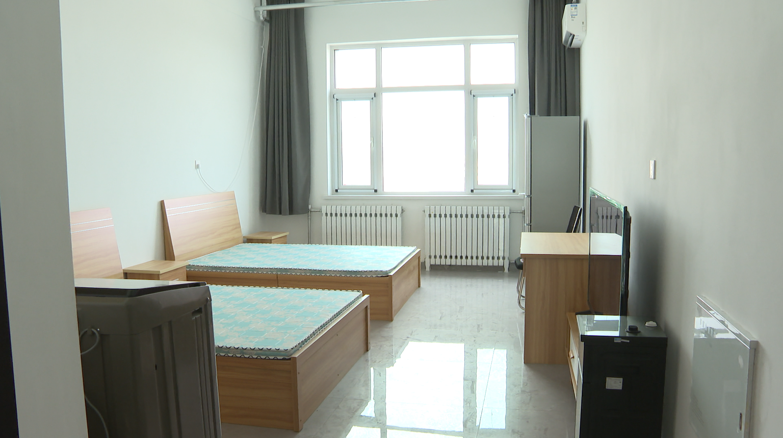 在金川区金贵四巷深处,五层楼高的金川区保障性住房巍然矗立,米白色墙体与湛蓝天空相映成趣,楼宇间错落的玻璃窗折射出温暖光影。走进里面,有单人间、双人间以及4人间多种房型,更是配备了电视、电冰箱以及洗衣机等多种生活设施。