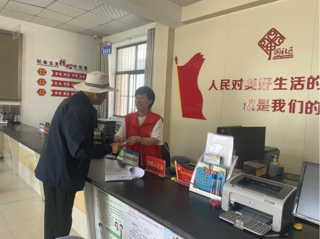 △金川路街道金水里社区便民服务站工作人员正在向群众发放评价卡