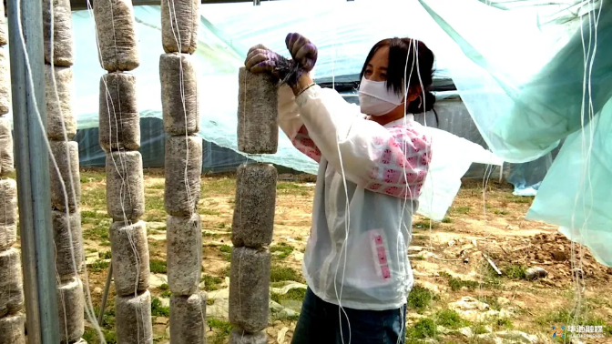 庆阳市双升农业开发有限公司技术员魏美庆:“挂袋和地摆的区别就是,地摆的情况下,空间利用率低,挂袋利用率高,它是地摆的三至四倍,看挂袋的高度和层数。挂袋的好处就是采的木耳比较干净,杂质少。”