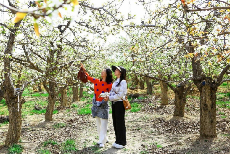 近日,游客在文殊镇石桥村梨花园内赏花、游玩。