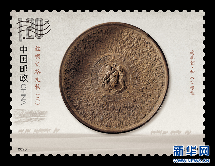 新华网兰州5月19日电(记者李杰)18日,《丝绸之路文物(三)》特种邮票首发仪式在甘肃省博物馆隆重举行。该套邮票共4枚,精选陆上丝绸之路沿线的四件珍贵文物——汉代“五星出东方利中国”锦护膊、南北朝神人纹银盘、北周凸钉玻璃碗、唐代胡人牵驼载丝壁画,以4.8元面值和590万套的发行规模,向世界讲述丝路文明的璀璨故事。