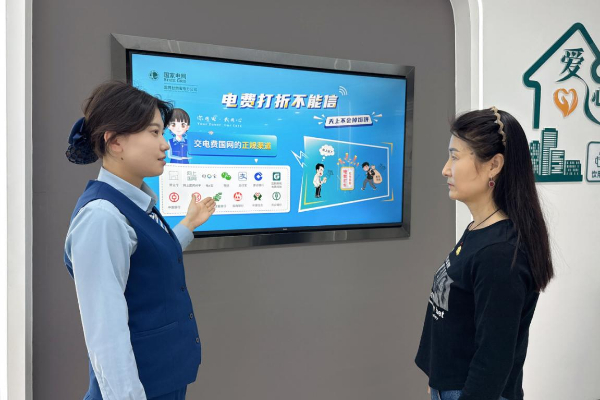 工作人员主动走向每一位前来办理业务的客户,指着营业厅电视机上循环播放的“电费打折不能信”宣传图片,耐心讲解着防范电费诈骗的要点。