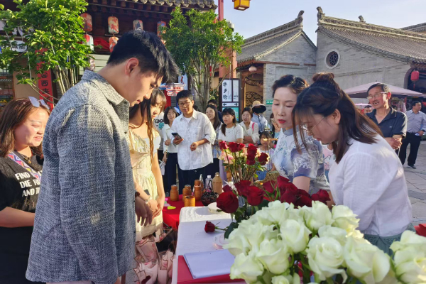 在推介会现场,大门镇工作人员向游客详细讲解本地玫瑰的生长特性、药用价值等优势。在“花艺沙龙”环节,花艺师现场教大家包扎花束,向对方表达爱意。“送你一枝玫瑰”互动游戏环节更是点燃全场,参与者手持玫瑰鲜花,大胆向亲友喊出爱的祝福,欢呼声与掌声此起彼伏,让古城弥漫着温馨浪漫的节日氛围。